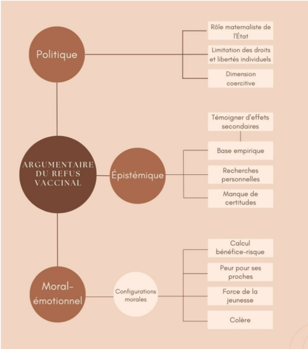 A l’observation de la littérature, trois répertoires d’opposition à la vaccination sont saillants (Galchen, 2022 : 68). Premièrement, le refus du vaccin est un choix politique selon Ollivier-Yaniv (2017) et Guimier (2021) car celui-ci s’inscrit pleinement dans un contexte politique et social, dans lequel la vaccination joue un rôle central pour la préservation du lien social entre les individus. Le vaccin a une fonction importante en ce qu’il rassemble les individus ou les éloigne ; il devient une composante même des fondements du lien social. En somme, la vaccination et la méfiance qui l’accompagne nous renseignent sur le rapport qu’entretient la population avec les autorités politiques en place (Guimier, 2021 : 230). En effet, la méfiance vaccinale semble étroitement corrélée avec la confiance envers les autorités politiques et sanitaires. Le refus de la vaccination serait lié au refus des décisions des politiques et celui-ci s’inscrit donc pleinement dans une contestation sociale (Zielinska, 2021 : 150).