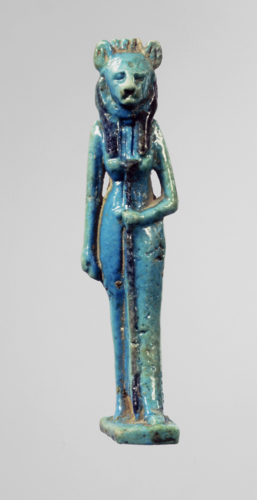 Simultanément, de très nombreuses sources indiquent que Sekhmet était l’une des principales divinités invoquée par les Égyptiens pour se protéger de divers fléaux, y compris des maladies. Plusieurs rituels accomplis dans les temples égyptiens permettaient d’apaiser la colère de la déesse, et d’éviter ainsi la propagation des fléaux qui lui étaient attribués. Des offrandes étaient également régulièrement présentées à la déesse pour se concilier les faveurs de cette dernière, et ce aussi bien par le personnel des temples que par des particuliers. Certaines pratiques documentées en Égypte montrent par ailleurs que la déesse pouvait non seulement être apaisée, mais qu’elle pouvait aussi, à certaines conditions, jouer un rôle actif dans la protection de l’individu contre différents maux, dont vraisemblablement les maladies. De très nombreuses amulettes à l’effigie d’une déesse-lionne ont ainsi été retrouvées en Égypte, et même au-delà, qui avaient pour fonction de protéger ceux qui les portaient (figure 2). Plus spécifiquement, on peut penser que ces amulettes servaient à la fois, pour celui qui les portait, à se placer sous la protection de la déesse et à invoquer sa puissance destructrice pour éloigner les forces hostiles. Des statuettes votives étaient également offertes à la déesse par des particuliers dans des chapelles, afin de s’attirer ses faveurs ou de lui présenter une requête spécifique. Parmi les requêtes inscrites sur ces statuettes votives, on trouve notamment celle d’accorder la « vie » ou la « santé » au dédicant. Par ailleurs, le rôle de Sekhmet non seulement dans la prévention des maladies, mais également dans leur guérison, est indiqué par l’existence d’une catégorie de prêtres consacrés à la déesse et ayant un rôle de guérisseurs. Bien que le rôle exact de ces prêtres ne soit pas très clair dans les sources égyptiennes, il ressort de ces documents qu’ils étaient impliqués dans des rituels thérapeutiques et qu’ils avaient pour fonction d’invoquer le pouvoir de la déesse dans le contexte de ces rituels.