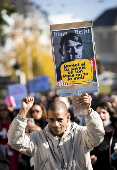 La deuxième série de photos ci-dessous, tirée du quotidien 24 heures, ont été prises lors d’une manifestation à Lausanne. Celle-ci a été convoquée par l’association politique Amis de la Constitution dans plusieurs villes de Suisse, le 16 octobre 2021, pour dire “Non au pass sanitaire et aux restrictions de nos libertés”[4]. La manifestation a réuni près de 1000 personnes à Lausanne. La série montre le défilé dans la rue Louis Ruchonnet.