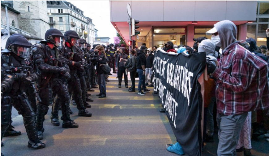 Que nous racontent les photographies ? Tout d’abord, avant de proposer une narration de nos sept photographies, il semble nécessaire de les contextualiser. Ces dernières ont toutes été capturées pendant la crise du coronavirus, puis publiées dans la presse après l’entrée en vigueur de mesures sanitaires. Lors de la rentrée académique 2021, l’obligation du certificat sanitaire pour accéder aux Hautes Écoles a été instaurée. En novembre de la même année, des votations au sujet d’un référendum visant à modifier les lois prises par la Confédération en mars 2021, dont l’instauration du certificat COVID, ont eu lieu. Le printemps et l’automne 2021 ont donc été traversés par de nombreuses réactions et mobilisation des citoyen·ne·s hostiles à ces mesures. Notre corpus s’inscrit dans cet espace-temps.